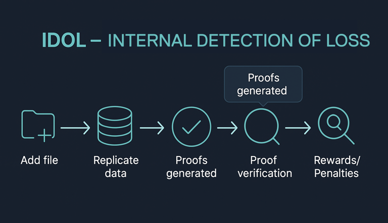 Internal Detection Of Loss (IDOL). Redundancy is enforced by protocol. If an SP misses enough proofs, the contract is flagged, penalties apply, and the file becomes eligible for re-replication: another SP can fetch from remaining replicas, resume proofs, and restore the target replication level, all tracked and incentivized on chain.